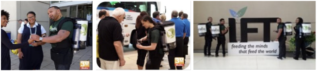 Your prominently uniformed brand ambassadors will provide morning beverage service at the major hotel bus routes or as they enter the convention center, via Rocket Man serving technology. This backpack serving technology is very high tech and will be remembered.