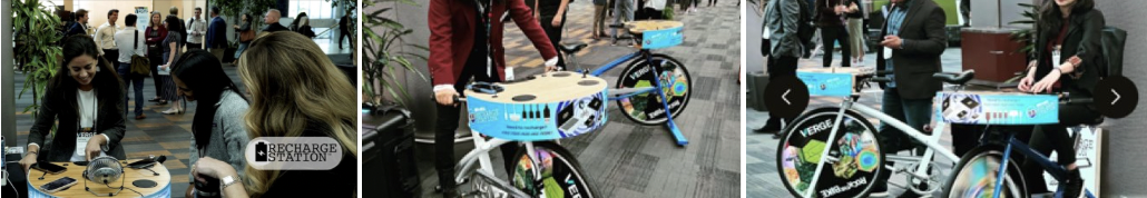 Generate green energy and recharge your phone. As conferences guests pedal branded stationary bikes, electricity is generated that charges up to six mobile phones.